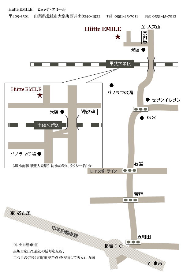 JR小海線「甲斐大泉駅」より徒歩約5分、タクシー約1分(約500m) * 小淵沢駅より定額タクシー送迎(有料・事前予約制)承ります。 【 東京から 】 新宿駅 → 小淵沢駅 ( JR中央本線特急 約2時間 ) 【 名古屋から 】 名古屋駅 → 塩尻駅 → 小淵沢駅 ( JR中央本線特急 約2時間40分 ) JR小海線へ乗り換え「甲斐大泉駅」下車 【 東京から 】 高井戸IC → 長坂IC ( 中央自動車道 ) 【 名古屋から 】 名古屋 → 小牧JCT → 長坂IC ( 東名高速/中央自動車道 約2時間40分 ) 長坂ICを出て最初の信号を左折、 二つ目の信号( 五町田交差点 )を左折して天女山方向 |